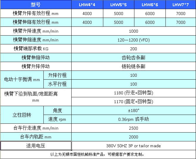 根據(jù)橫臂末端承載能力,我司焊接操作機(jī)可以分為LHQ輕型、LHZ中型、LHW重型和HCJ超重型。每一個(gè)類(lèi)型的操作機(jī)都可以按照客戶(hù)的要求進(jìn)行設(shè)計(jì)制造。以下為我司標(biāo)準(zhǔn)LHW重型焊接操作機(jī)的主要參數(shù)。
